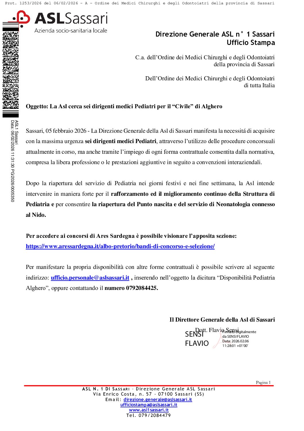 Per manifestare la propria disponibilità con altre forme contrattuali è possibile scrivere al seguente indirizzo: ufficio.personale@aslsassari.it , inserendo nell’oggetto la dicitura “Disponibilità Pediatria Alghero”, oppure contattando il numero 0792084425.
