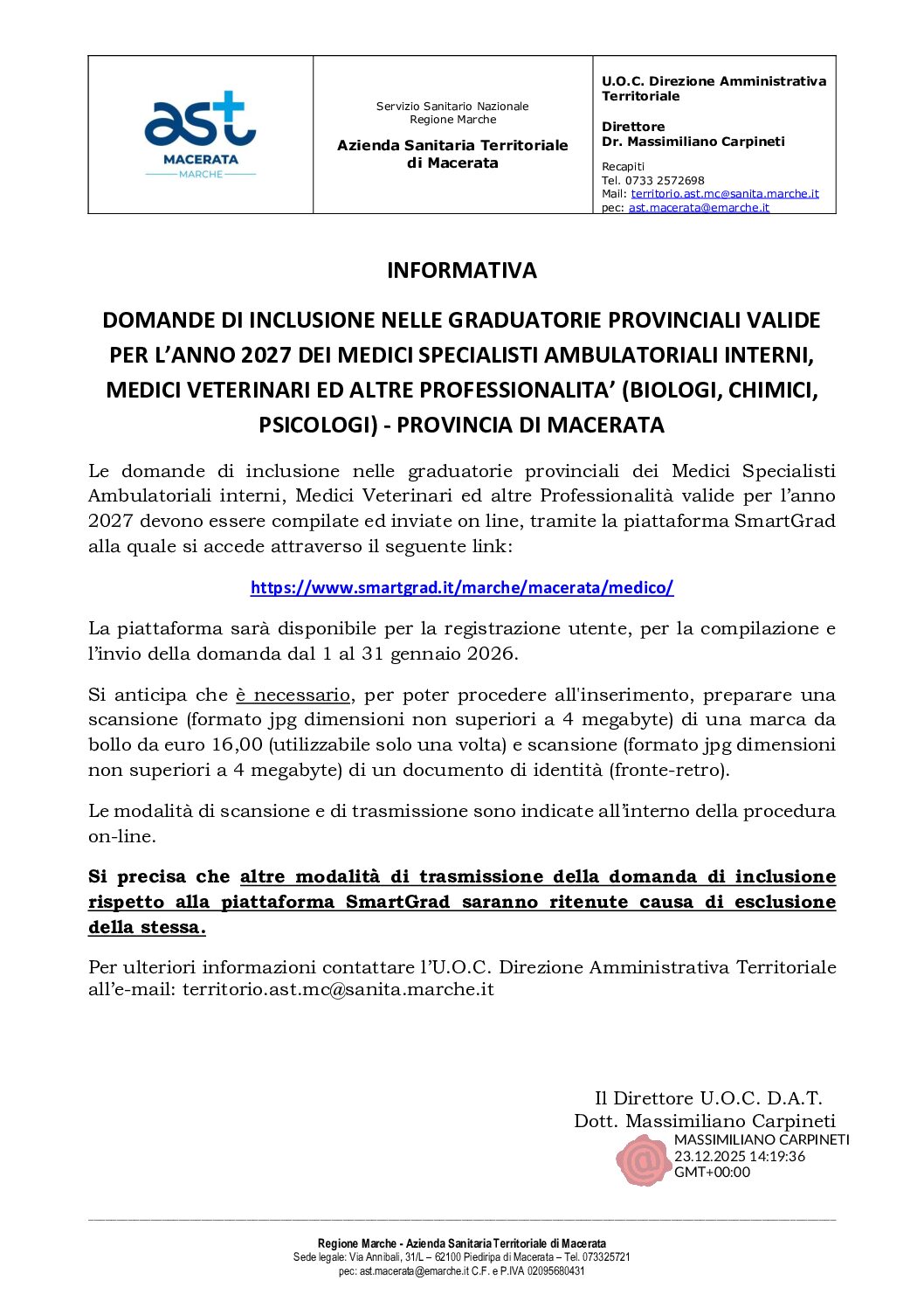 Le domande di inclusione nelle graduatorie provinciali dei Medici Specialisti Ambulatoriali interni, Medici Veterinari ed altre Professionalità valide per l’anno 2027 devono essere compilate ed inviate on line, tramite la piattaforma SmartGrad alla quale si accede attraverso il seguente link: https://www.smartgrad.it/marche/macerata/medico/