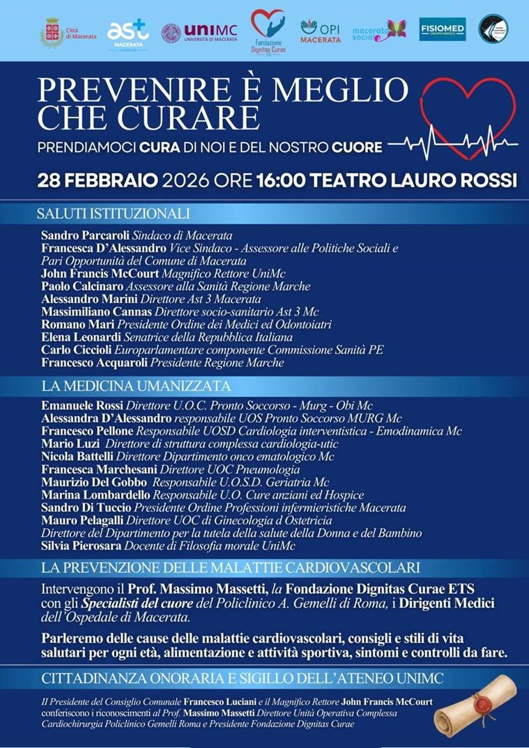 In occasione del convegno verranno consegnate la cittadinanza onoraria della Città di Macerata e il sigillo dell’Ateneo di UniMcal Prof. Massimo Massetti, Direttore del Dipartimento di Scienze Cardiovascolari della Fondazione Policlinico A. Gemelli di Roma, Ordinario di Cardiochirurgia all’Università Cattolica del Sacro Cuore e Presidente della Fondazione Dignitas Curae ETS e redattore del Manifesto Dignitas Curae, documento rivoluzionario al centro sia del percorso di cura che della relazione medico-paziente, sviluppando l’idea di una sanità più umanizzata ed efficiente.