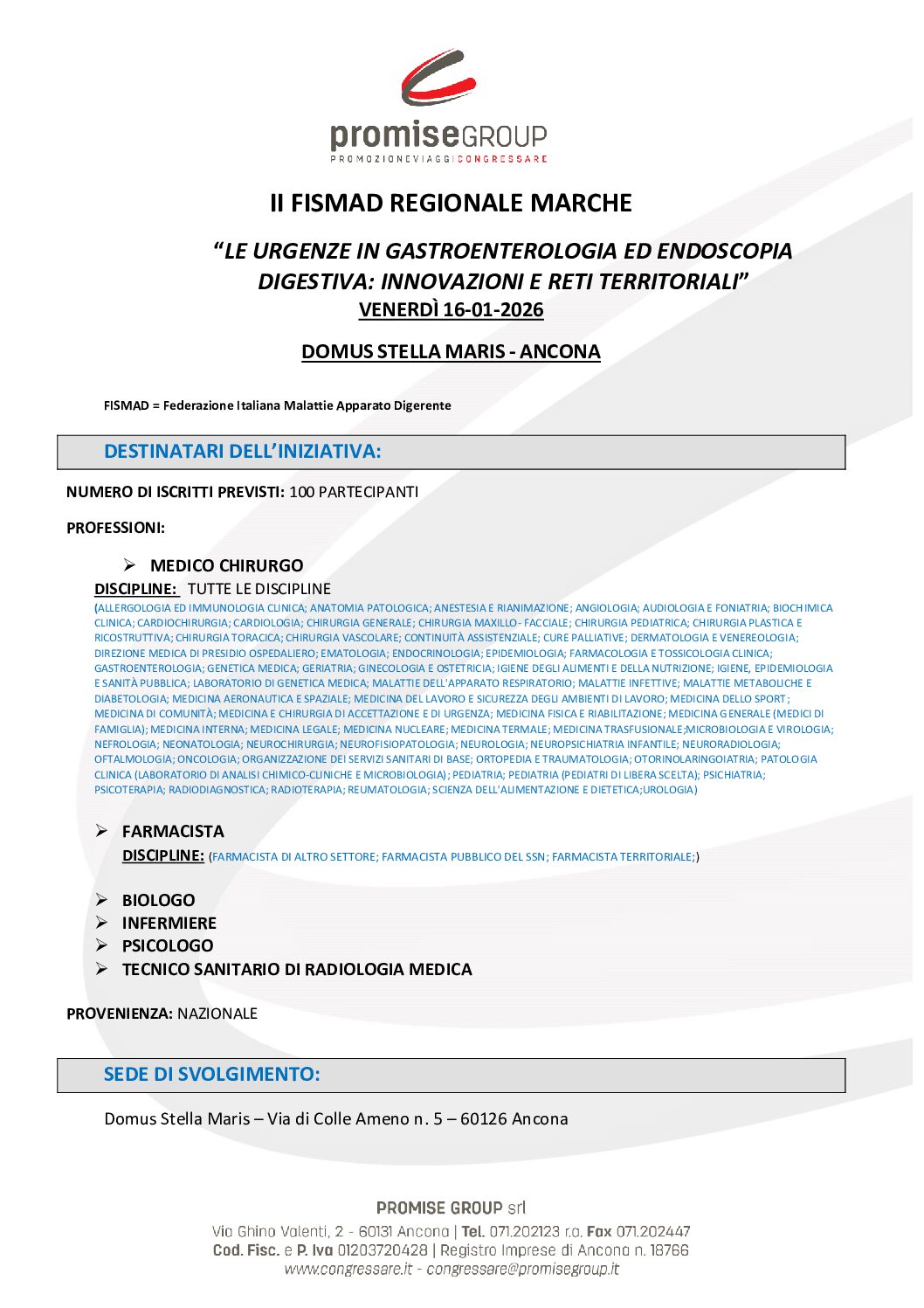 27 Maggio 2024 presidenza omceo 0 Comments Provider: PROMISE GROUP SRL Segreteria organizzativa: 071202123 Patrocinio dell’ Ordine dei Medici Chirurghi ed Odontoiatri di Macerata 16/01/2026 – Domus Stella Maris – Ancona – Partecipazione gratuita – CREDITI ECM: 7 PROGRAMMA ALLEGATO AGENAS