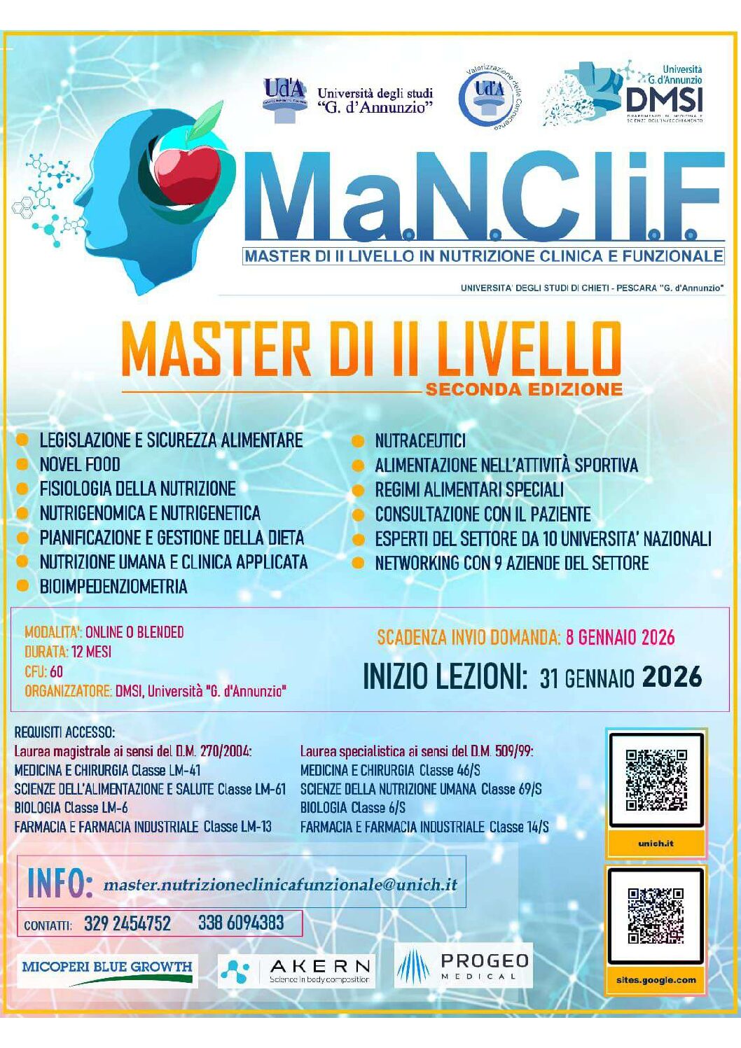 MASTER DI II LIVELLO IN NUTRIZIONE CLINICA E FUNZIONALE – UNIVERSITA’ DEGLI STUDI G. D’ANNUNZIO – CHIETI-PESCARA
