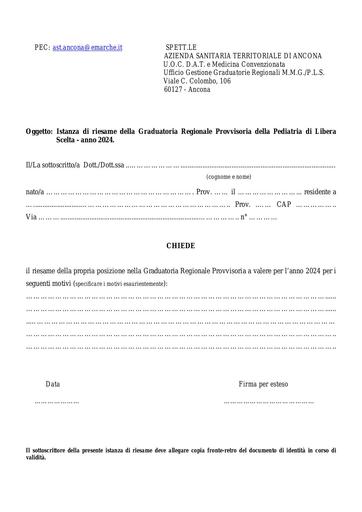 Home » Documenti News » REGIONE MARCHE – GRADUATORIA PROVVISORIA PEDIATRIA DI LIBERA SCELTA ANNO 2024 Cartella REGIONE MARCHE – GRADUATORIA PROVVISORIA PEDIATRIA DI LIBERA SCELTA ANNO 2024 Home » Documenti News » REGIONE MARCHE – GRADUATORIA PROVVISORIA PEDIATRIA DI LIBERA SCELTA ANNO 2024 » Comunicato relativo alla Graduatoria PROVVISORIA Regionale della Pediatria di Libera Scelta, valevole per l’anno 2024 pdf Comunicato relativo alla Graduatoria PROVVISORIA Regionale della Pediatria di Libera Scelta, valevole per l’anno 2024 Pubblicato il 30 Maggio 2024 Modificato il 30 Maggio 2024 Di netcubo 73 download Scarica (pdf) Comunicato relativo alla Graduatoria PROVVISORIA Regionale della Pediatria di Libera Scelta, valevole per l’anno 2024.pdf Home » Documenti News » REGIONE MARCHE – GRADUATORIA PROVVISORIA PEDIATRIA DI LIBERA SCELTA ANNO 2024 » Elenco degli esclusi dalla Graduatoria PROVVISORIA Regionale della Pediatria di Libera Scelta, valevole per l’anno 2024 pdf Elenco degli esclusi dalla Graduatoria PROVVISORIA Regionale della Pediatria di Libera Scelta, valevole per l’anno 2024 Pubblicato il 30 Maggio 2024 Modificato il 30 Maggio 2024 Di netcubo 76 download Scarica (pdf) Elenco degli esclusi dalla Graduatoria PROVVISORIA Regionale della Pediatria di Libera Scelta, valevole per l’anno 2024.pdf Home » Documenti News » REGIONE MARCHE – GRADUATORIA PROVVISORIA PEDIATRIA DI LIBERA SCELTA ANNO 2024 » Graduatoria PROVVISORIA Regionale della Pediatria di Libera Scelta, valevole per l’anno 2024 (in Ordine di Punteggio ed in Ordine Alfabetico) pdf Graduatoria PROVVISORIA Regionale della Pediatria di Libera Scelta, valevole per l’anno 2024 (in Ordine di Punteggio ed in Ordine Alfabetico) Pubblicato il 30 Maggio 2024 Modificato il 30 Maggio 2024 Di netcubo 138 download Scarica (pdf) Graduatoria PROVVISORIA Regionale della Pediatria di Libera Scelta, valevole per l’anno 2024 (in Ordine di Punteggio ed in Ordine Alfabetico).pdf Home » Documenti News » REGIONE MARCHE – GRADUATORIA PROVVISORIA PEDIATRIA DI LIBERA SCELTA ANNO 2024 » LINK AST ANCONA link LINK AST ANCONA Pubblicato il 30 Maggio 2024 Modificato il 30 Maggio 2024 Di netcubo 88 download Scarica Home » Documenti News » REGIONE MARCHE – GRADUATORIA PROVVISORIA PEDIATRIA DI LIBERA SCELTA ANNO 2024 » Modulistica per eventuali istanze di riesame pdf Modulistica per eventuali istanze di riesame Pubblicato il 30 Maggio 2024 Di netcubo 108 download Scarica (pdf, 6 KB) Modulistica per eventuali istanze di riesame.pdf